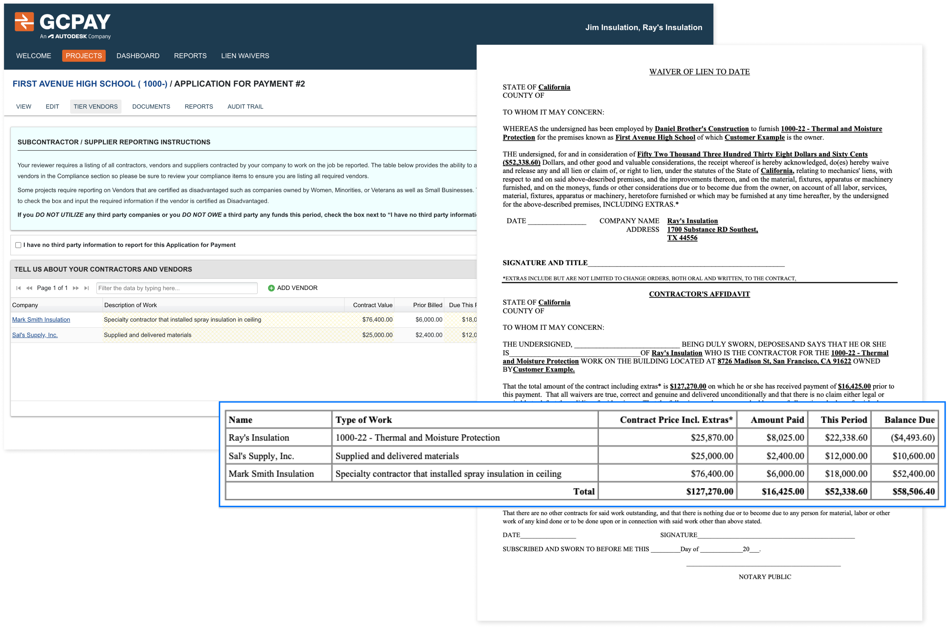 This update builds on the Digital Sworn Statement feature that was released in September 2024, allowing GCPay to support the Chicago Title Waiver and Contractor Affidavit format. This format requires the subcontractor data to be embedded in the contractor affidavit table alongside the tier vendor/supplier data. Please talk to your account manager if you'd like to give this update a closer look!